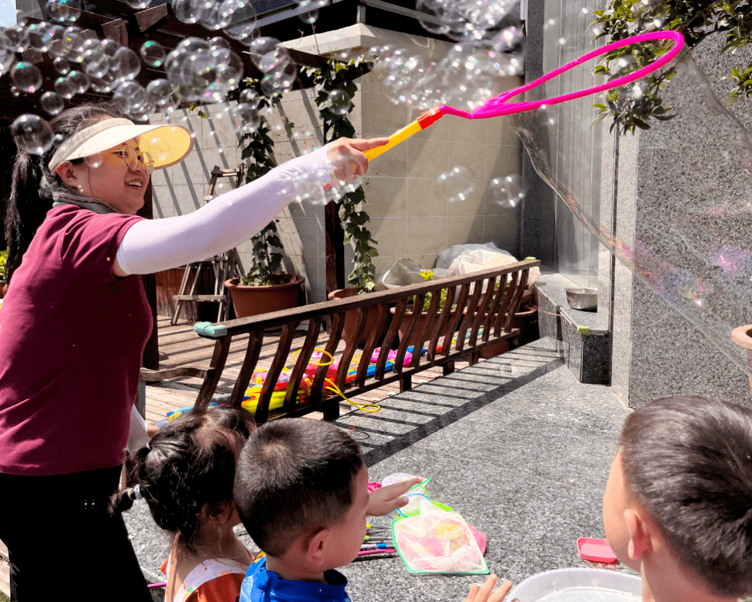 教师带领孩子们一起玩吹泡泡喽