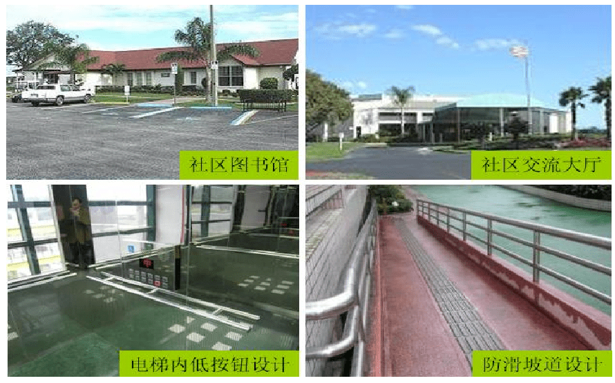小区内以无障碍步行道、无障碍防滑坡道、低按键、高插座等无障碍设计为主,并对建筑的方位感、交通的安全性及道路的可达性均做了缜密的安排。