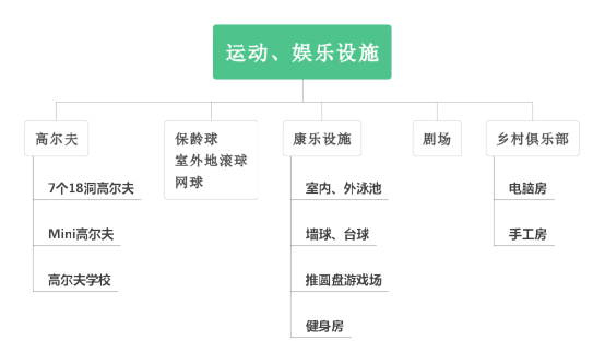 (2) 体育活动 (Physical Activities) :高尔夫和小小高尔夫,游泳,足球场,马场,滑旱冰,网球和桌球,健身房,手球式墙球,室外地滚球,跳舞,草地保龄球,慢跑和竞走,推园盘游戏,垒球和篮球,合球;