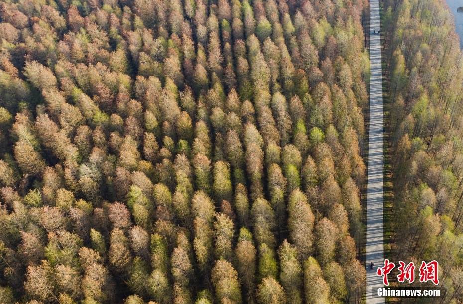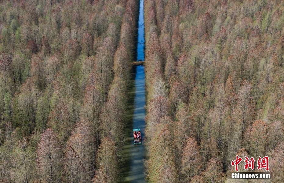 4月2日,江苏淮安,航拍金湖水上森林万亩水杉林。金湖水上森林景区总占地?积12000亩,是江苏地区规模最大的人工湿地生态林,从空中鸟瞰,生态怡人美如画。(无人机照片)中新社记者 泱波 摄
