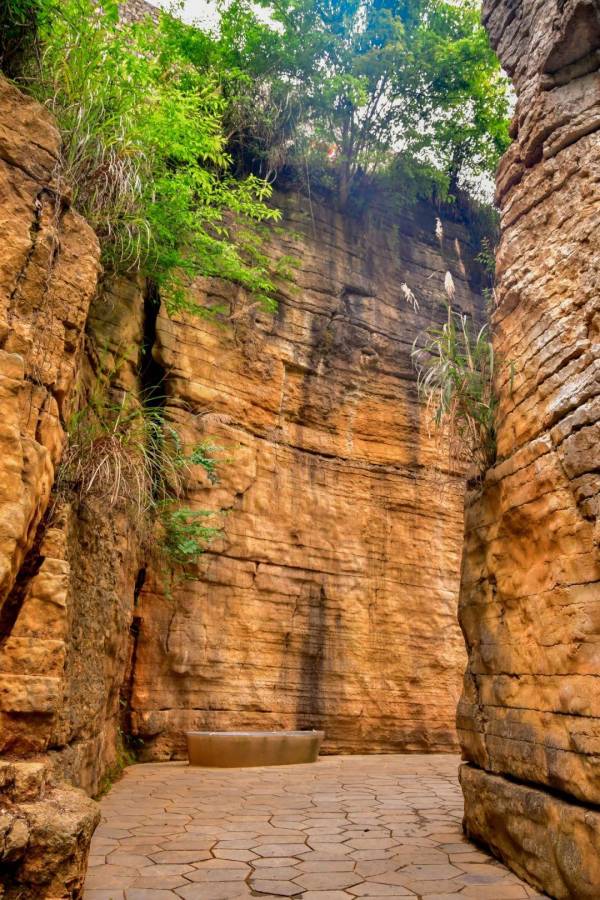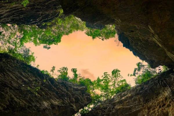“天眼地缝”距今已有上万年历史,因云贵高原地壳运动的张力撕裂了山体,而形成的一处奇特的景观。炎炎夏日走进地缝如进入冰窟,凉风迎面而来,凉爽无比,别有洞天。