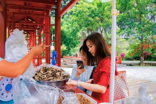 在牛角塘附近的许愿石广场上,当地居民叫卖着此地特有的小食美味,油炸小鱼、石墨凉粉、琅琊土豆……每一样都各具特色,令人口齿留香回味无穷。
