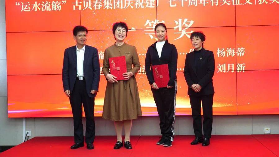 ▲获得“运水流觞”古贝春集团庆祝建厂七十周年有奖征文一等奖两位作家上台领奖