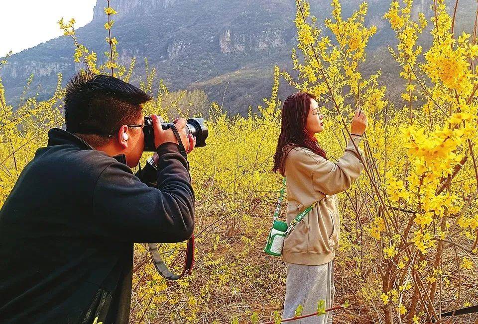 太行山上,游客正在金黄灿烂的连翘花丛中拍照留念。吴艳斐摄