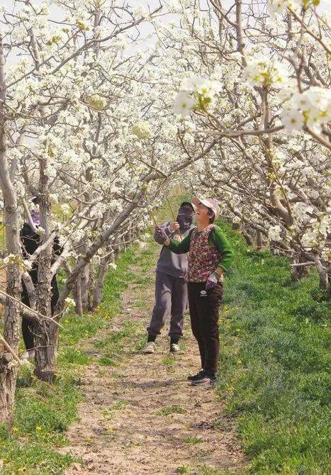 繁花之下,勤劳的农人正踮着脚尖,倾斜身子,晃动手里自制的授粉杆,为一朵朵娇艳的梨花传粉,那脸上洋溢着的笑容,似是看到了这美丽繁华的梨花,变成了秋日的累累硕果。