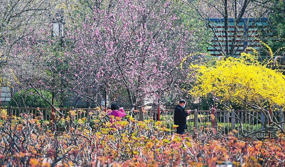 “春风如贵客,一到便繁华”。粉红的榆叶梅花、粉白的紫叶李花、鲜红的贴梗海棠花、紫色的丁香花、金黄的连翘花……三步一丛,五步一片,姹紫嫣红,芳香扑鼻,与绿树、蓝天相映成画,令人心旷神怡。踏青赏花的市民络绎不绝,或独自信步,或三五成群,赏花闻香,拍照留影,欢声笑语此起彼伏。