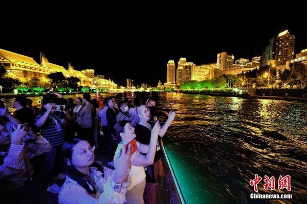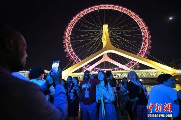 在天津参加第十四届夏季达沃斯论坛的中外参会者乘坐游船,夜赏海河两畔美景。