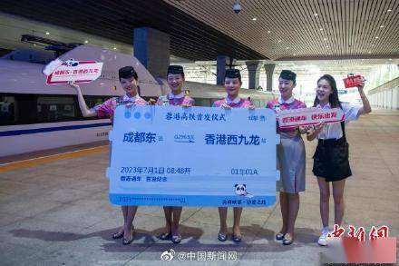7月1日8时48分,成都首次开往香港的蓉港高铁列车正式从成都东站发车,预计经过10小时左右抵达香港西九龙站,晨观西岭雪山、夜赏维港美景的小目标可以达成了!列车上,成都元素满满,乘务人员新款制服融合了巴蜀特色的纹样、大熊猫元素、成都市花芙蓉红等,将巴蜀文化和铁路文化巧妙融合。蓉港高铁将极大地满足成都、香港两地的人员流动和经贸需求。网友:还可以从香港打包一杯丝袜奶茶到成都吃火锅!(祝欢)