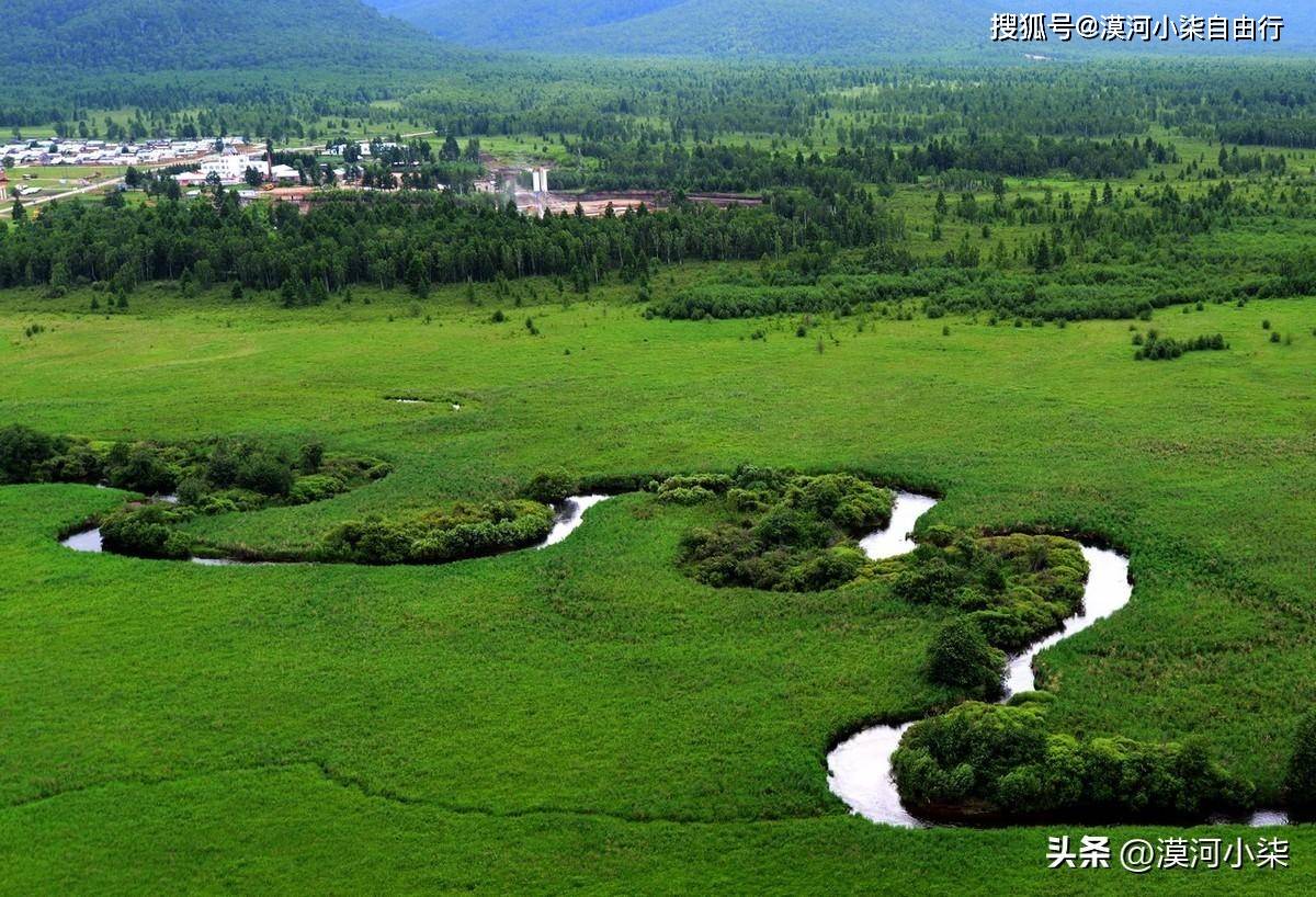 额尔古纳湿地:被称为亚洲第一湿地,登高俯瞰,曲水环抱草甸,岸边矮树灌木丛生,绿意盎然,湿地上花草摇曳,山间白桦林连绵成片。