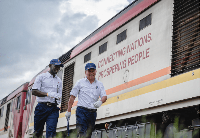 2023年5月23日,在肯尼亚内罗毕,来自中国的火车驾驶员蒋立平(右)与来自肯尼亚的学员霍勒斯从一辆印有“连接国家,走向繁荣”标语的蒙内铁路机车旁走过。新华社记者 王冠森 摄
