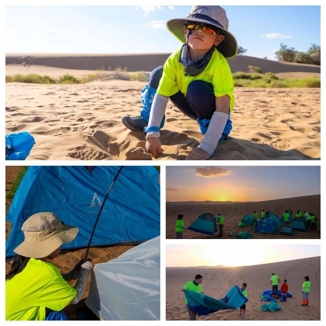 下午家庭为单位开始进行沙漠徒步,预计下午18:30到达营地休整,由亲子间互相配合,完成帐篷的搭建,用心搭建今晚在沙漠的小窝。在营地稍作休息,领队将带领大家做系列拉伸运动,以防第二天腿脚酸痛。