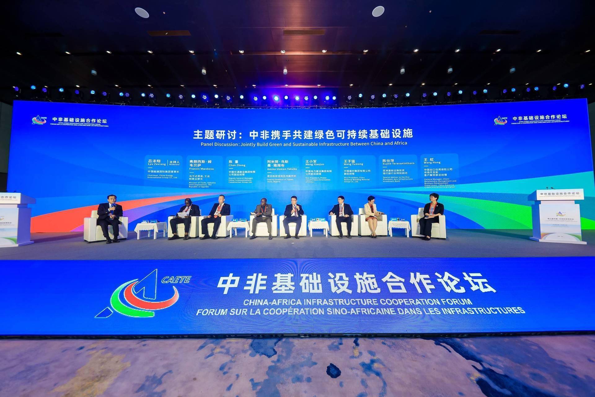 在主题研讨环节,乌干达贸易、工业和商业部长弗朗西斯·姆韦贝萨、中国交通建设集团有限公司副总经理陈重、尼日利亚吉加瓦州副州长阿米努·乌斯曼·雅库布、中国电力建设集团有限公司副总经理王小军、中国建材集团有限公司副总经理王于猛、亚洲基础设施投资银行副行长特别顾问陈仕萍、中国出口信用保险公司市场开发和客户服务部总经理王虹围绕“共建绿色基础设施:新基建、新技术、新能源”主题进行讨论。