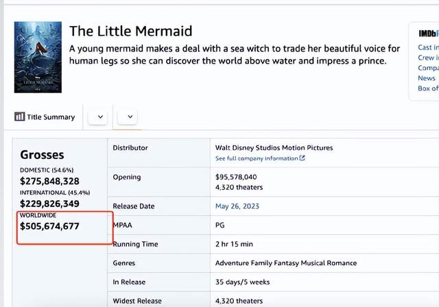 迪士尼大片《小美人鱼》上映之后,电影的票房突破5.5亿美元。