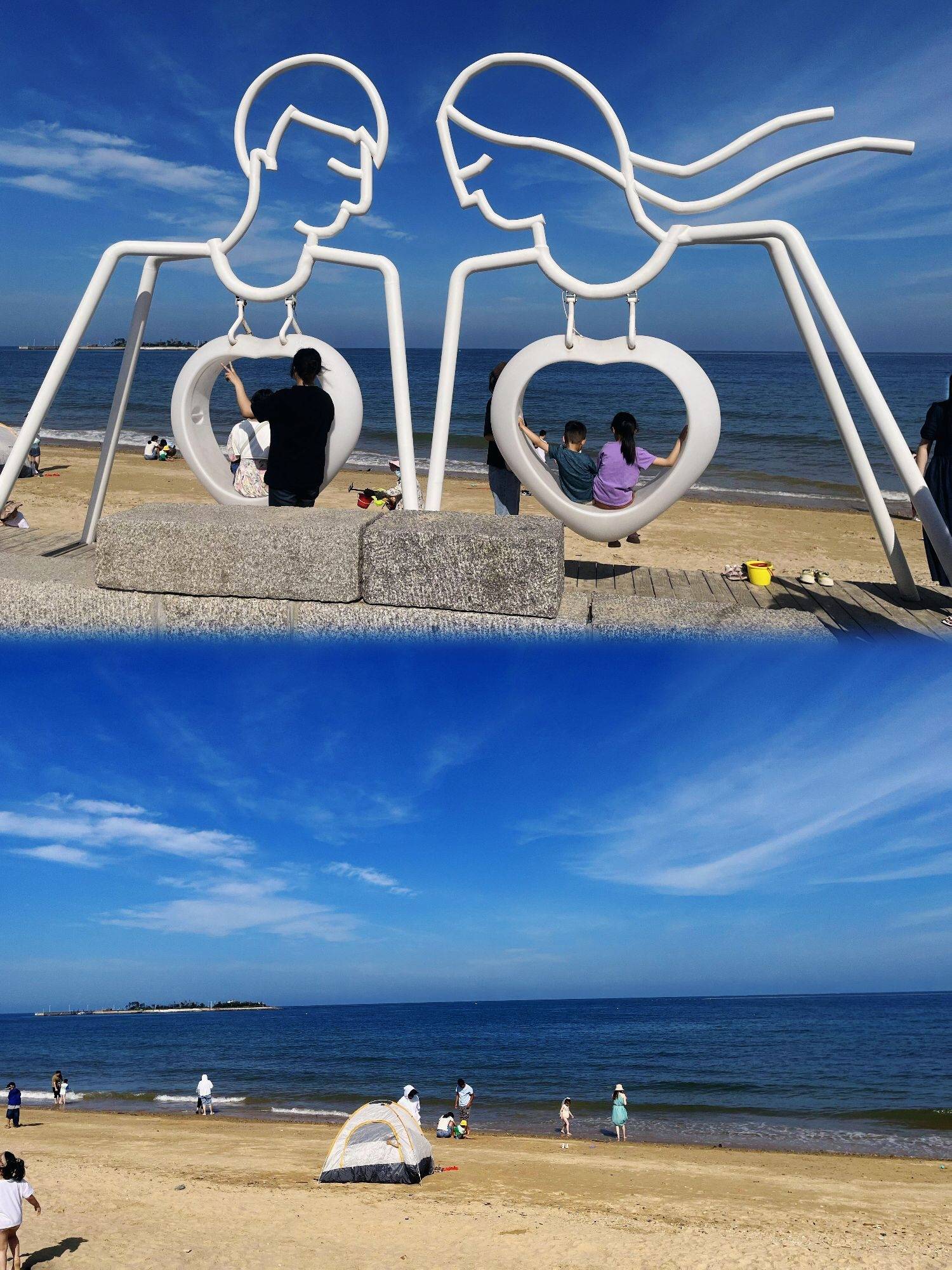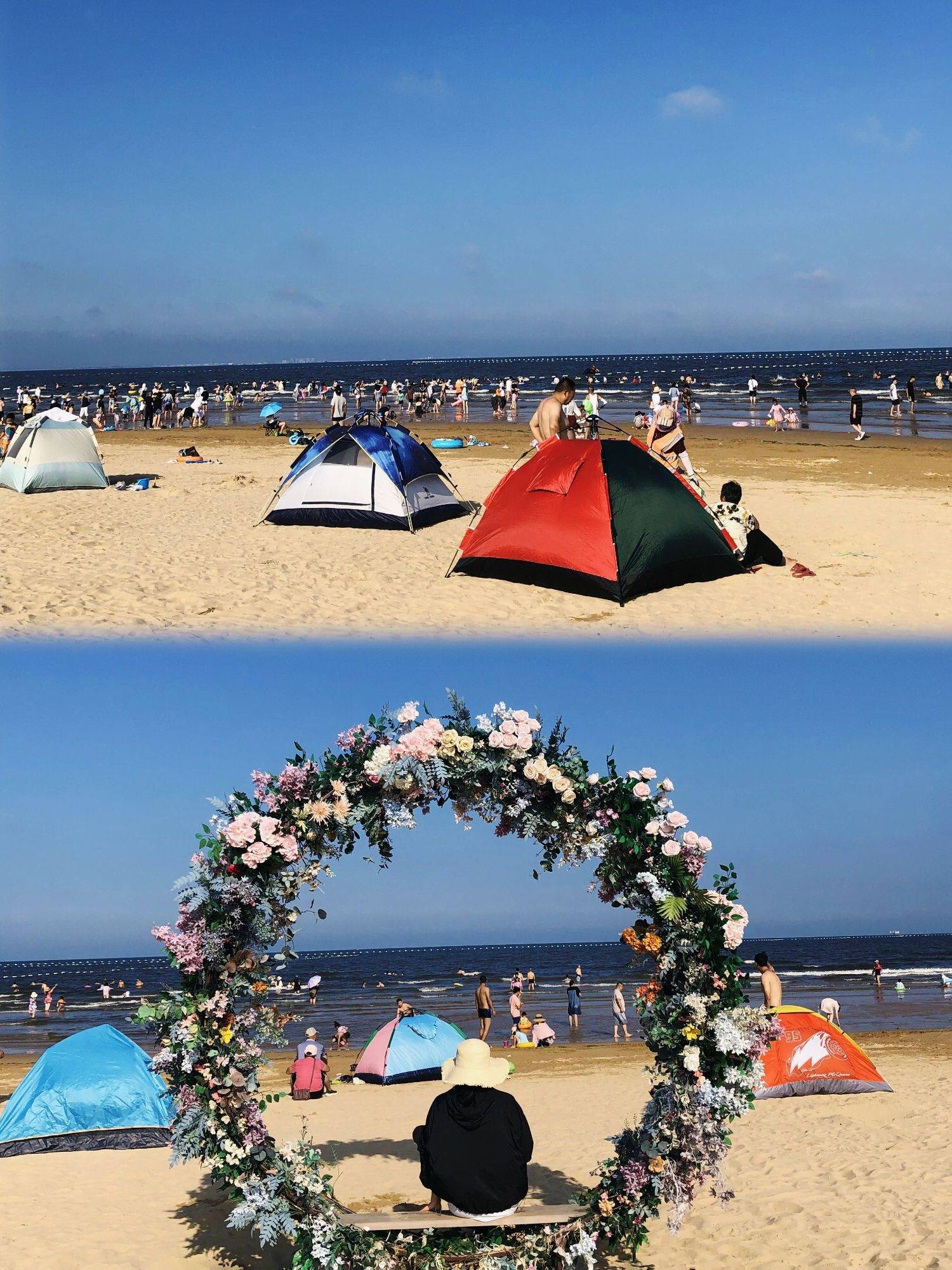 一个可以搭帐篷的沙滩,打开帐幕,一线海景映入眼底,沙滩🏖️、大海,在天幕下,享受「观澜咖啡」买的咖啡和甜点,以及「巧克力渔家」打包的清蒸、香辣口味的海鲜🍤。