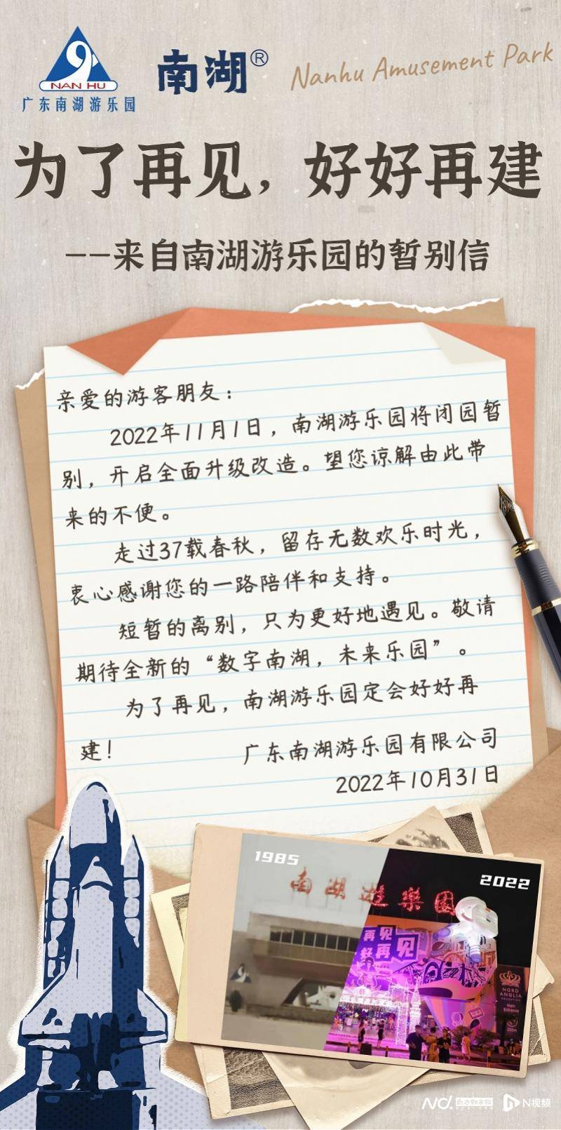 2022年,广东南湖游乐园的“打铁花”表演开启了闭园前的辉煌,也触动了众多广州市民对这座老牌游乐园的深情;10月31日,该园一封告别信,“为了再见,好好再建”,告知了陪伴广州37年的南湖游乐园进入“重启”阶段,将建造中国第一个太空科幻类元宇宙主题公园。