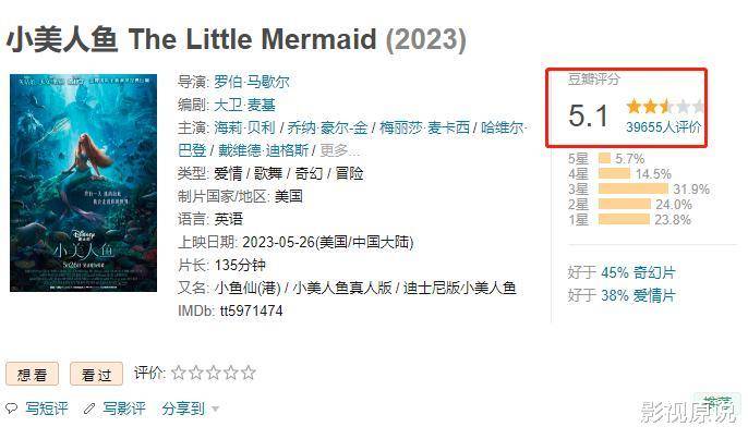 因此这部真人版《小美人鱼》在上映之后,也是得到了媒体、影评人以及观众们的集体差评。在豆瓣网上,该片的评分就只有5.1分,妥妥的一部烂片。