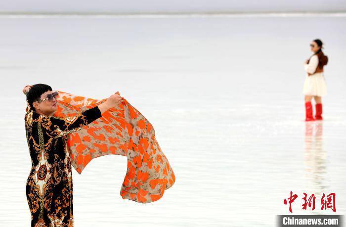 图为游客在茶卡盐湖之中。 薛蒂 摄
