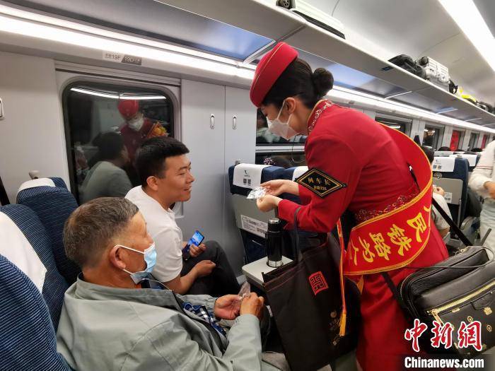 7月1日,青藏铁路西格段首发列车上,列车员们给乘客分发纪念品。 中新社记者 祁增蓓 摄