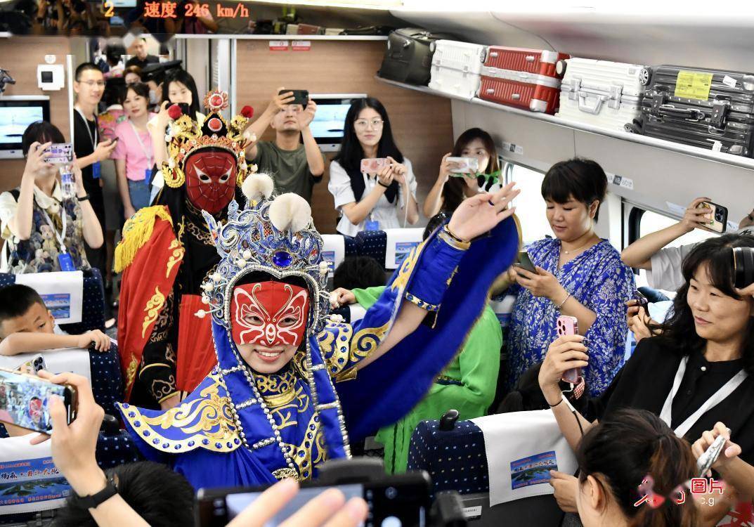 2023年7月1日,在G2693次列车上,工作人员为旅客表演节目。当日,一列满载着旅客的G2693次列车从成都东站驶出,标志着成都至香港高铁列车正式开行。(胡志强摄/光明图片)