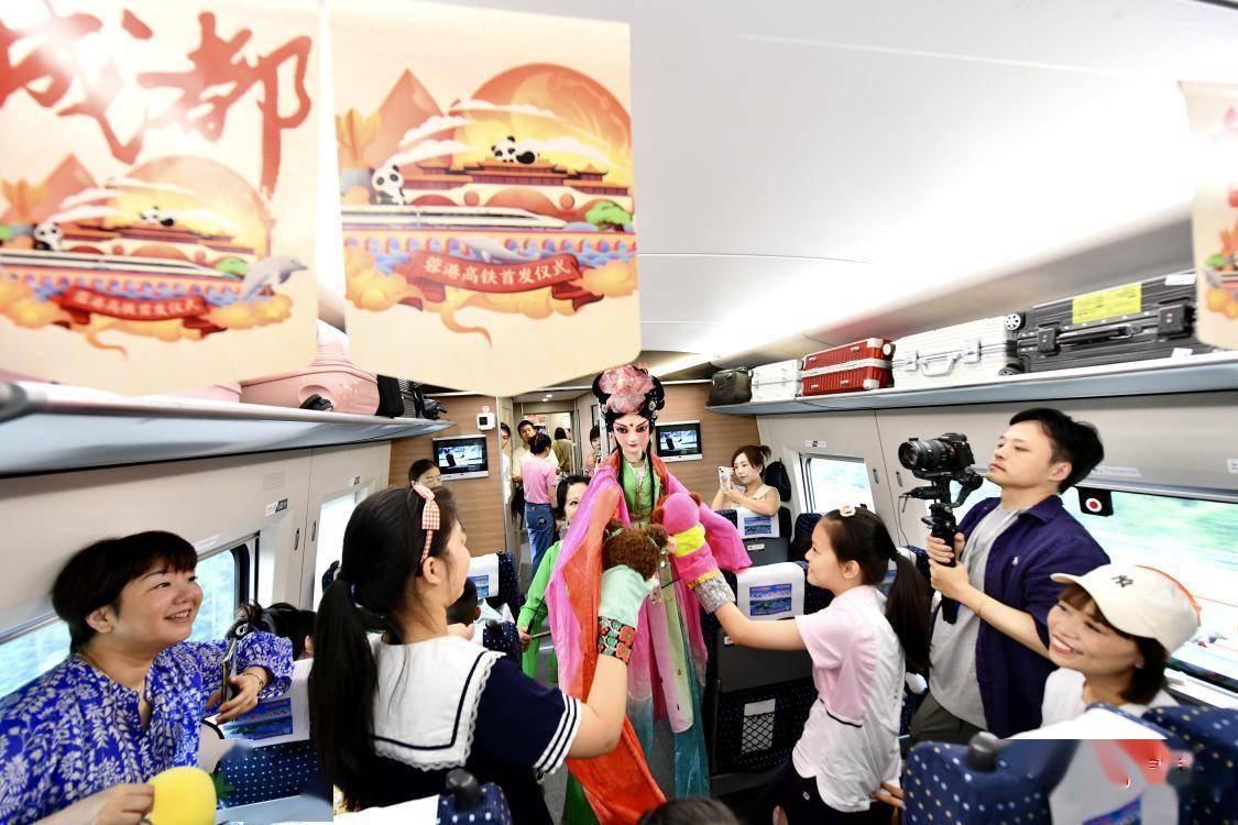 2023年7月1日,G2693次列车氛围浓郁。当日,一列满载着旅客的G2693次列车从成都东站驶出,标志着成都至香港高铁列车正式开行。(胡志强摄/光明图片)