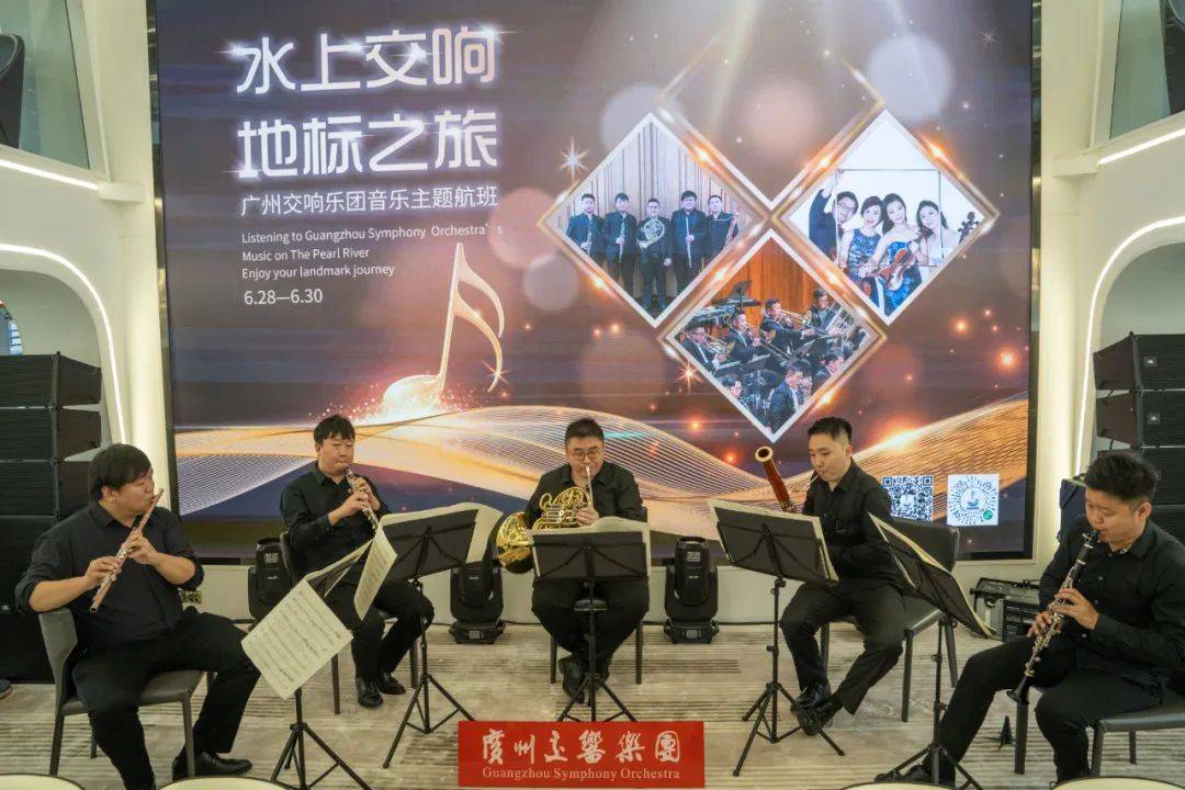 6月28日至30日连续三天,广州交响乐团“木管五重奏”“低音铜管重奏组”和“飞·粤”弦乐四重奏先后在广州塔财富码头登上珠江客位最大的纯电动游船“珠江王子号”,每天在前三个航班为游客们演奏及介绍中外名曲,带来共计9场精彩的音乐沙龙,让游客零距离感受古典音乐的魅力。