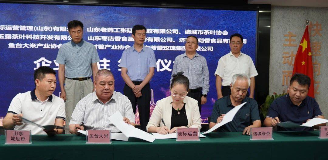 地标运营管理 (山东) 有限公司与山东老药工张廷銮阿胶有限公司、诸城市茶叶协会、济南南湖玉露茶叶科技开发有限公司、山东枣店香食品股份有限公司、济南屹铠香食品有限公司、鱼台大米产业协会、枣庄市甘薯产业协会、山东芳蕾玫瑰集团有限公司签署了地标大厦意向入驻协议。
