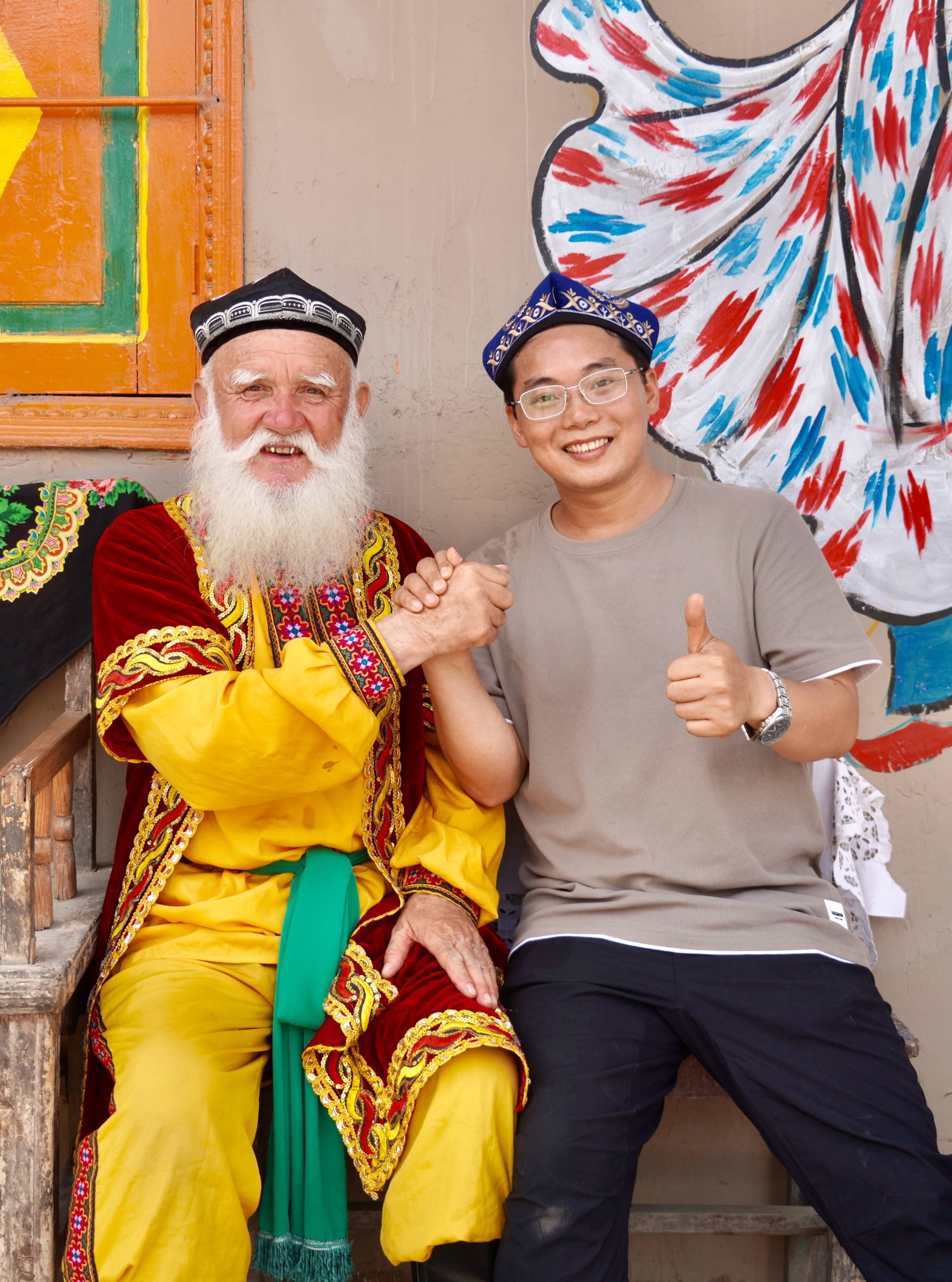 当地朋友介绍说,吾买尔爷爷性格开朗、乐观,长期投入库车的各项公益事业,积极参与古韵龟兹各种宣传,他用自己精彩丰富的人生故事和优秀的“萨玛尔”顶碗传统技艺舞蹈,弘扬了社会正能量。而对我们而言,遇到这样的老爷爷也是我们旅行中值得铭记的记忆,祝愿他健康、平安,期待下次去到库车的时候再去拜访他。