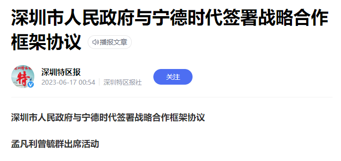 6月16日,宁德时代与深圳市政府签署战略合作框架协议,将聚焦新能源车换电、电动船舶、新型储能等领域展开全方位合作,助力深圳打造世界一流新型储能产业中心、加快建设世界新一代一流汽车城。