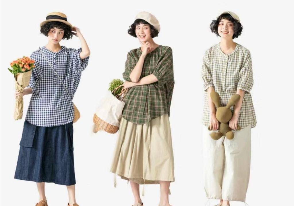 格子衬衫的日系休闲风,除了经典的翻领衬衫外,小圆领也很好看,带着一种柔顺的少女气息,搭配宽松的阔腿裤或者休闲裙,活力十足还是。可爱的。