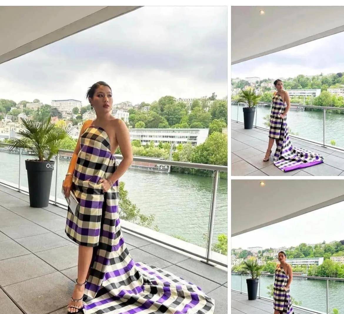 Sirivan公主还为这件衣服拍了一张全身照。诗丽梵公主精致的形象下显得亭亭玉立,十分时尚。