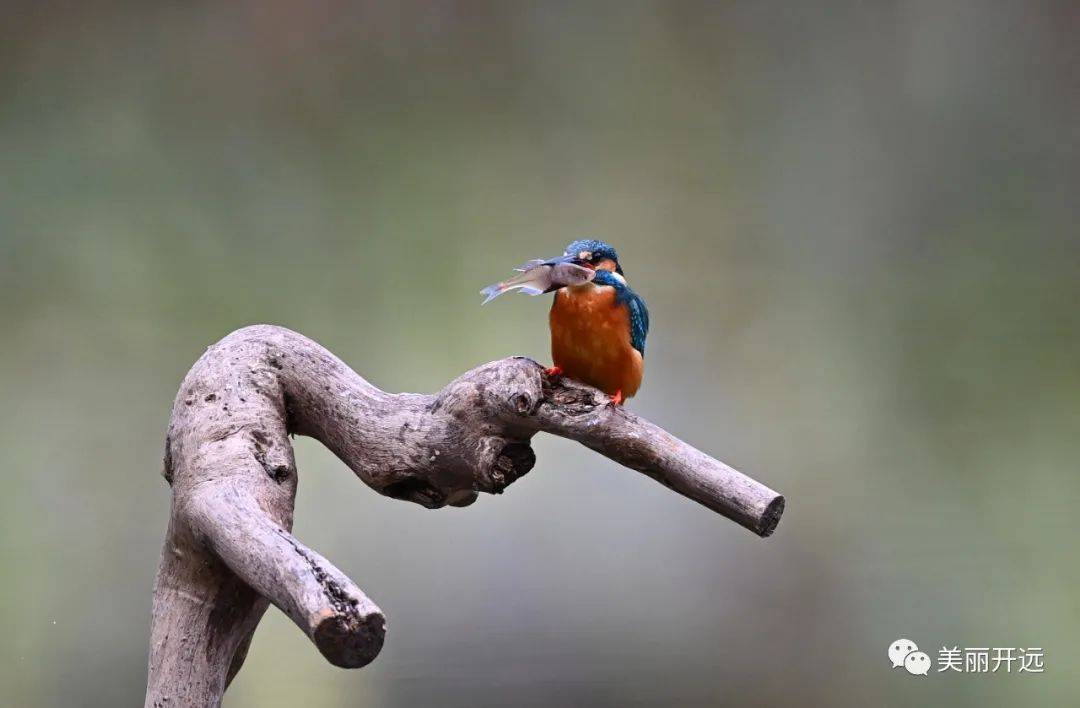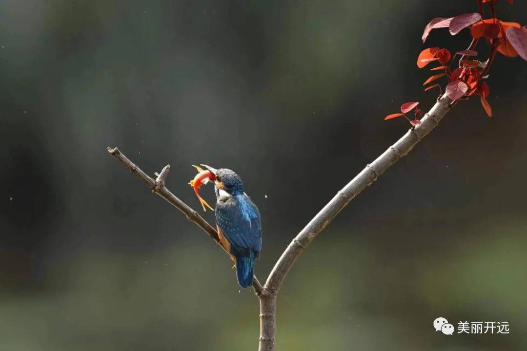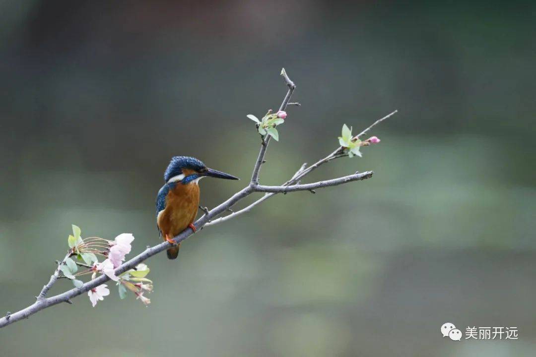 除此之外,翠鸟蓝绿色泛着光的背部、橙棕色的肚皮、红色的爪子、长长的喙,配上灵动的飞行,也成为吸引摄影爱好者的原因。它们一个猛子扎入水中,又叼着小鱼站立于花枝,成为春天里一道和谐美丽的风景线......