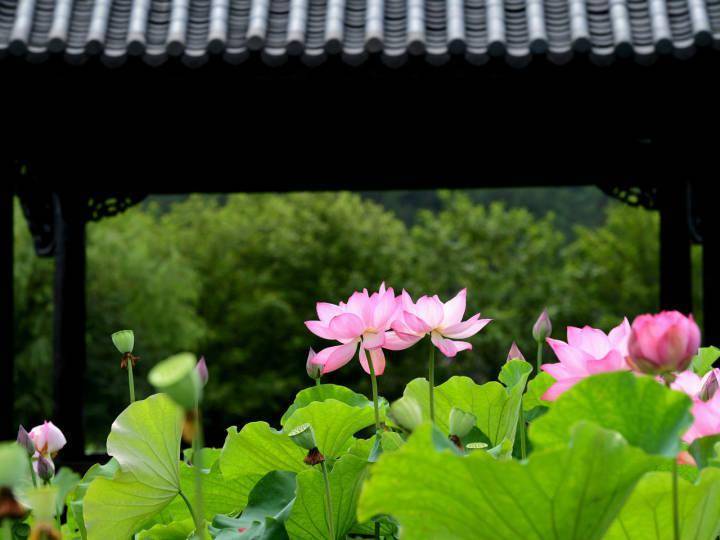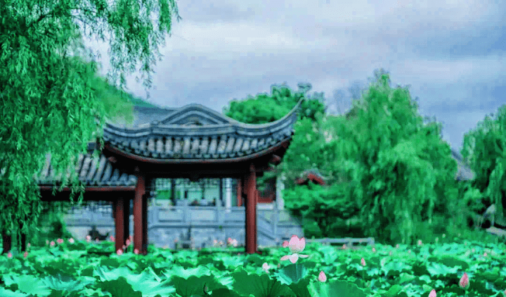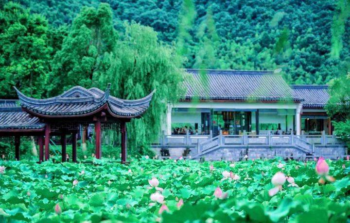 走进飞檐翘角的回廊凉亭,满池荷花盛开围绕身边,层层叠叠的荷叶翻飞,荷花在其间娉婷起舞。湖面吹来清爽的风,一扫酷暑难捱,也让衣角都沾染了花香。