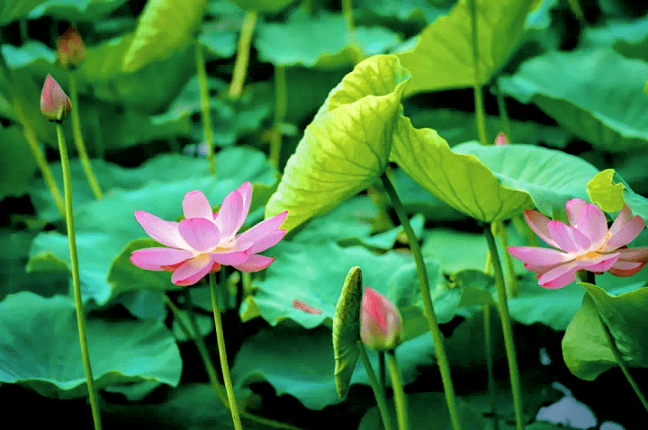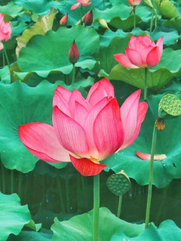 此时正值花期,娇艳莲瓣悄然盛开,为夏日增添清幽香气和美妙色彩。一片片莲叶像撑开的一张张绿伞,在碧波之上层层叠叠,衬托得荷花更加红艳娇媚。
