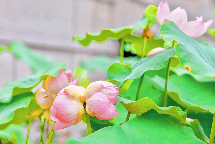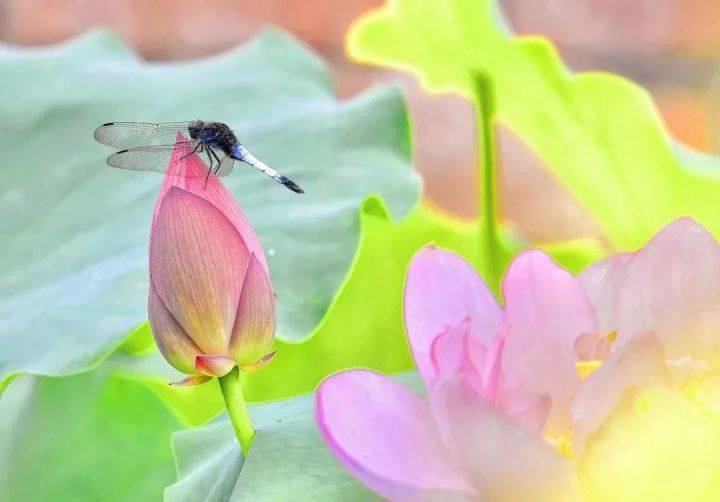 一朵朵粉色的荷花争相盛开,荷叶在微风中摇曳,使得这片荷塘又增添了几分诗情画意。时而还能看见蜻蜓低飞,停留在荷花上,构成一幅美丽的田园生态图。