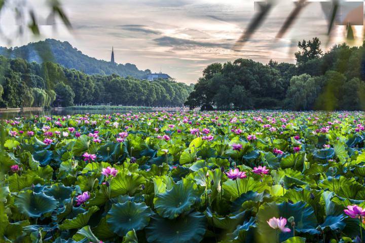 圆圆的荷叶随风摇曳,粉色的荷花静静绽放,西湖荷区因这夏日独有的清新而变得清凉而宁静。