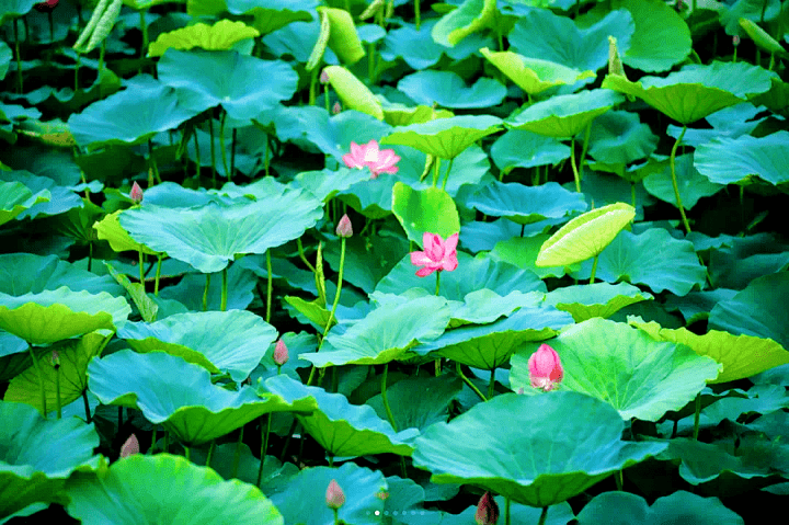 风儿吹来,荷花荷叶还有莲蓬互相碰撞,一片哗哗声在耳边响起,像是一首欢快的夏日歌曲。青碧的荷叶交错层叠,挤挤挨挨,仿佛直铺到天边。