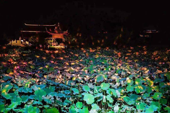 谁说只有白天能赏荷,夜色里的灵湖带着曲径通幽的神秘气氛,让跳动的灯光点缀荷塘。朦胧月色下,荷塘里的荷花仍然姿态万千,荷叶撑起了朵朵绽放的荷花,花瓣虽没有阳光下娇艳粉红,但在灯光的变化中,也如梦如幻,别有一番风情。