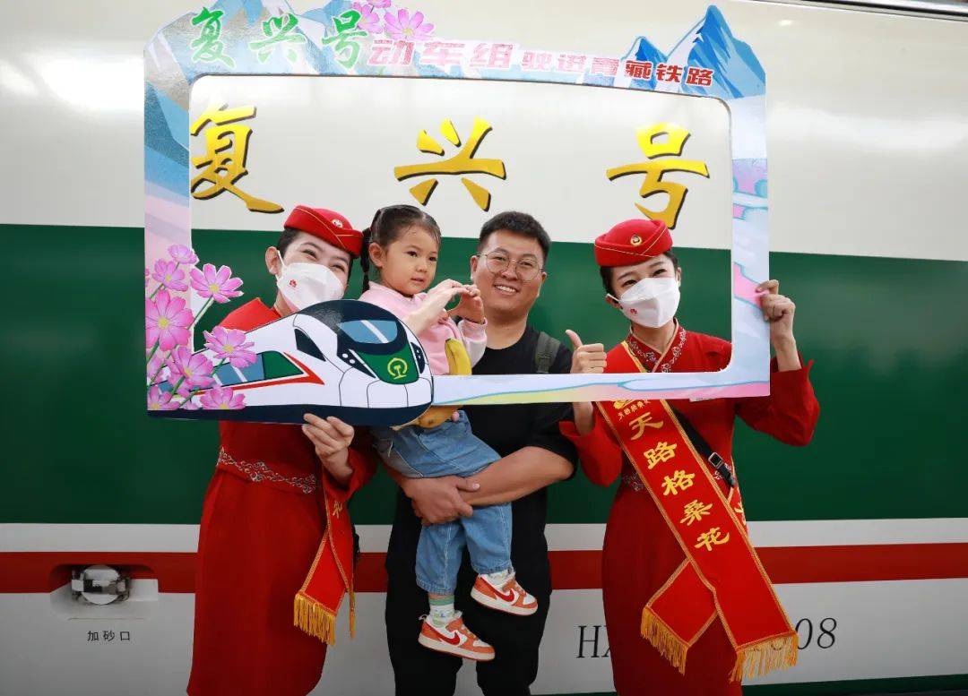 7月1日,乘客与乘务人员在西宁至格尔木动车组首发列车前合影留念。新华社