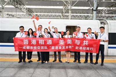 “蓉港相通、美美与共,我们出发啦!”7月1日上午8时20分,在成都开往香港的直达高铁G2963次列车外,成都市投促团队的工作人员们拿着中华人民共和国国旗、香港特别行政区区旗和“蓉宝”玩偶,高举双手奋力欢呼。他们将踏上成都开往香港的这趟首发列车,赴香港举办成都市投资环境推介(香港)暨粤港澳招商引智项目集中签约仪式。