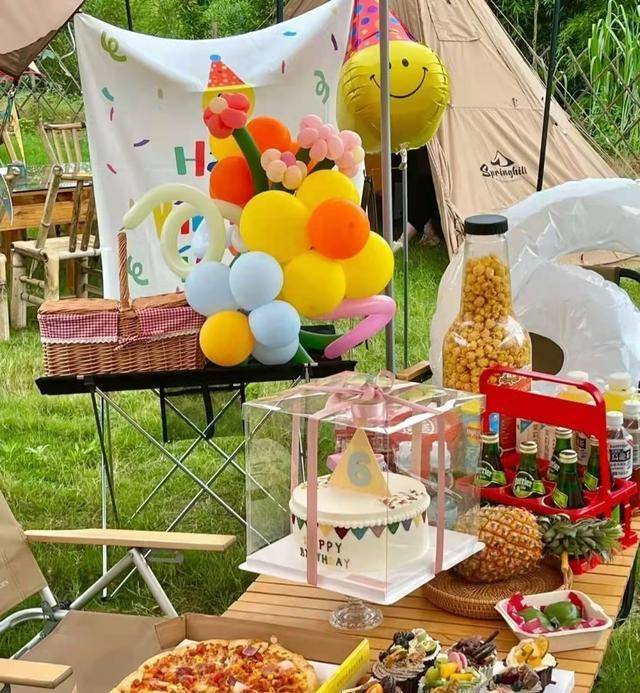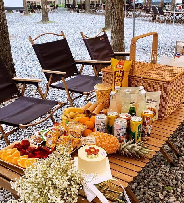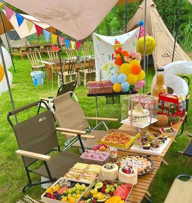 首先,搭建了一个舞台,搭建了一个漂亮的帐篷,并展示了帐篷的英文标志,并用彩色气球作为射击刀具。最后一件事是野餐食物。