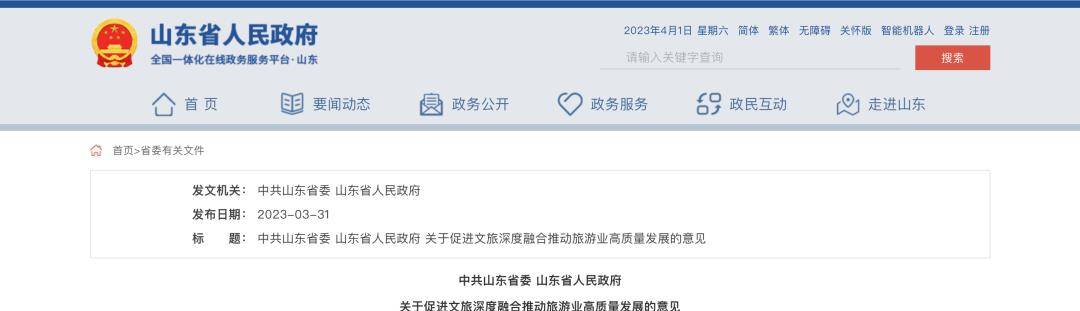《关于促进文旅深度融合推动旅游业高质量发展的意见》正式发布:锚定“好客山东”全域旅游示范区建设,着力打造济南都市圈、青岛都市圈文化旅游发展极,构建“两大都市圈拉动、三大公园引领、四廊一线贯通、八大片区支撑”的文旅深度融合发展新格局。
