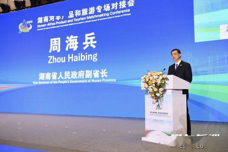 周海兵在致辞中指出,作为中非经贸博览会永久会址地和中非经贸深度合作的先行者、推动者,湖南主动服务国家战略,深度落实中非合作“九项工程”,依托工程机械、电力设备、建筑建材、文化旅游等优势产业,加快建立对非经贸合作交流长效机制,对非产品贸易呈现出蓬勃发展的良好态势。衷心期待以本次专场对接会为契机,推动双方名优特色产品互通互补,搭建产品贸易和文旅产业的高质量发展交流平台。我们将全面贯彻党中央决策部署,积极探索对非贸易新方式,为“走出去”加足马力;全面升级多元消费新模式,构建“非品入湘”贸易链;持续完善对非合作新机制,为中非合作提供更加优渥的政策,为构建更加紧密的中非命运共同体贡献湖南力量。
