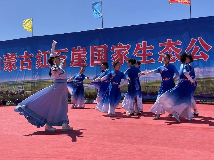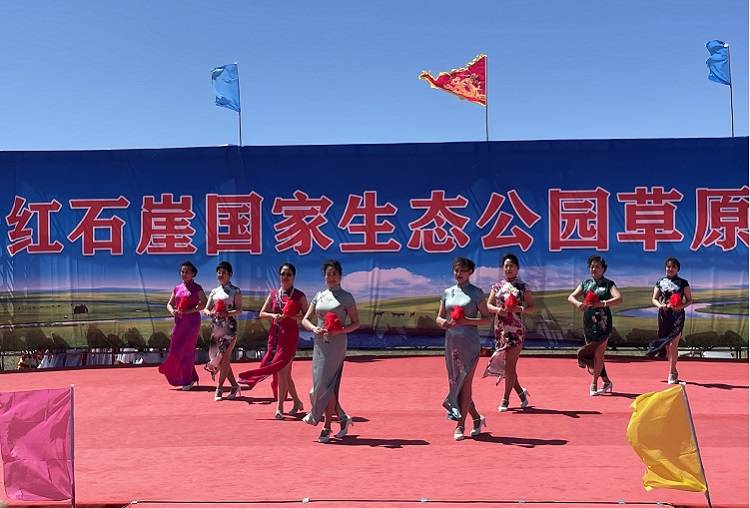 红石崖国家生态公园地处红石崖天赐牧场,是距离呼和浩特最近的高山草原。总占地面积为10万亩,境内不仅有著名的红石崖寺,还有温泉、9D网红玻璃桥是自治区唯一一家集宗教文化、草原文化、红色教育文化、田园文化、水上文化为一体的综合多元化疗养观光活动中心。远远望去,蓝天白云,绿草如茵,牛肥马壮,仿若一幅美丽的自然画卷铺陈开来,让人心旷神怡。记者在活动现场看到,除了大型民族歌舞、传统的二人台节目、旗袍走秀、博克、拔河等活动,还有精彩刺激的赛马活动,随着一声哨响,英姿飒爽的骑手们扬鞭策马,你争我赶,瞬间奔向远方,场面极其震撼。