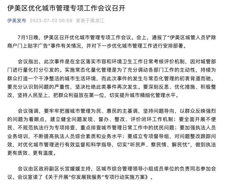 7月2日,据黑龙江“伊美发布”消息,7月1日晚,伊美区召开优化城市管理专项工作会议,通报了“伊美区城管人员铲除商户门上贴字广告”事件有关情况。