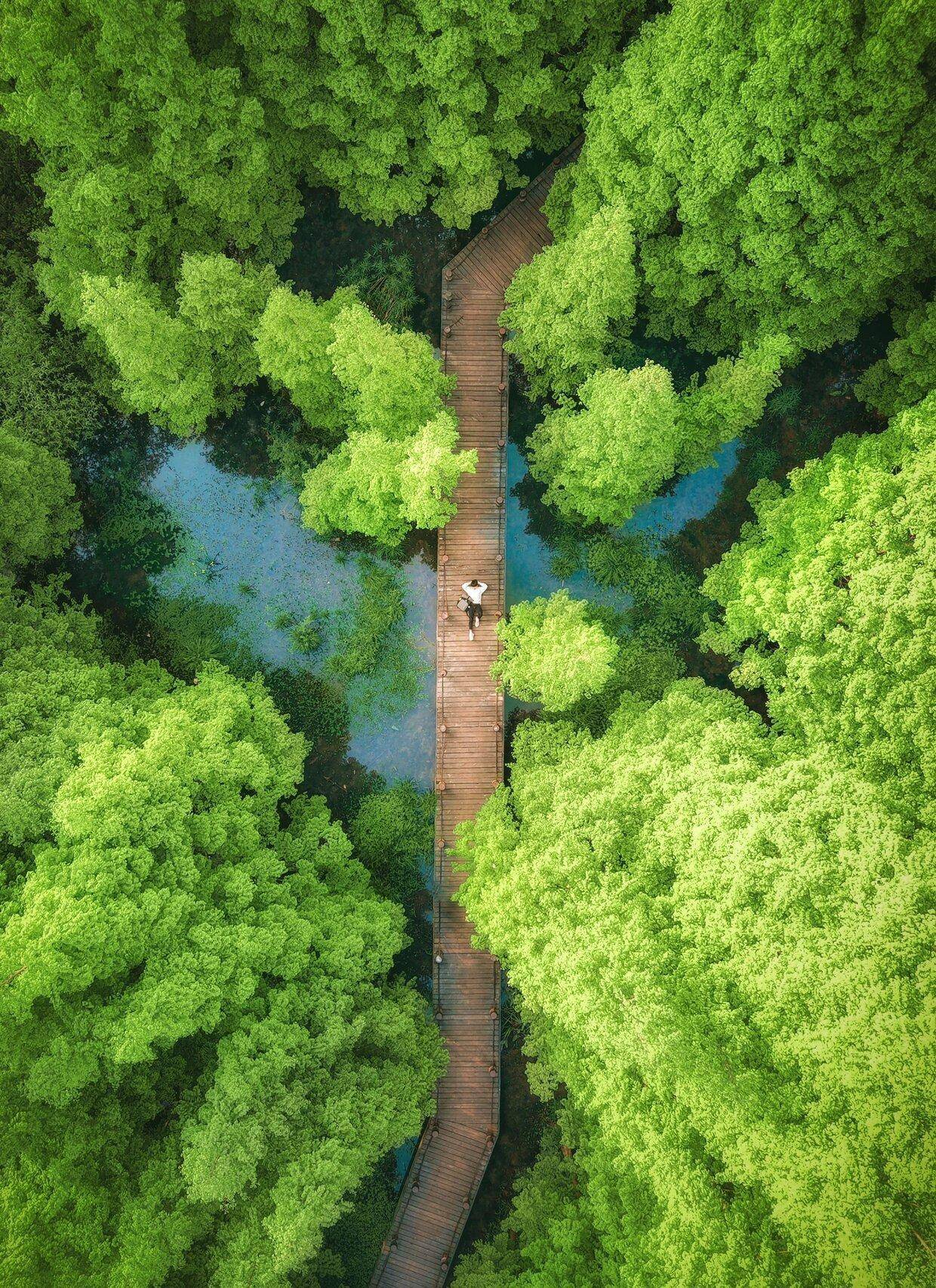 当你进入公园时,你一定会对水杉婆娑的身影感到惊讶。这些巨大的树木直立在水面之上,就像一座绿色的浮岛,令人魂牵梦绕。微弱的阳光透过伞的缝隙照射到水面上,与绿色的鸭子混合在一起,营造出美丽的光影,仿佛步入了奥兹国的神奇世界。