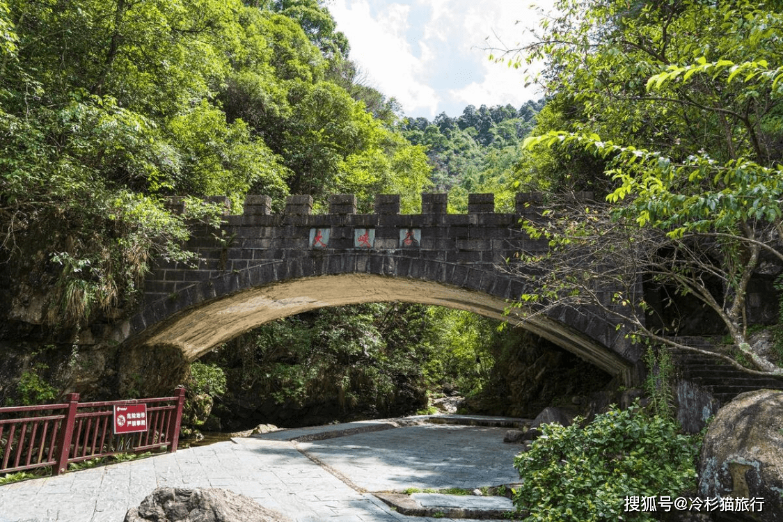 这里的石梁飞瀑,在崇山翠谷之中,瀑布喷涌而下,被誉为"天下第一奇观";