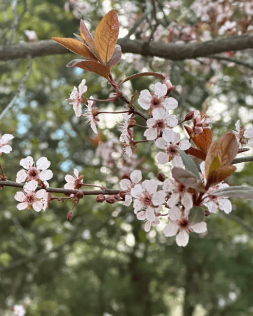 园区西部,杏花的开放已接近尾声,随风飘落满地的花瓣,与刚刚开放的紫叶李和粉嫩的榆叶梅高低错落地交叉在一起相应成趣,别有一番风味。