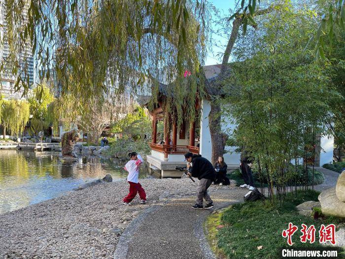 在湖边,中国戏曲元素结合英文说唱的音乐吸引了游客们驻足。在悉尼从事汽修工作十余年的华人杨女士带着儿子艾迪在湖边拍摄音乐短视频。穿着印有红色京剧脸谱卫衣的艾迪伴着动感音乐起舞。“我非常喜欢这里中西结合的感觉。希望在公共场合拍摄能培养孩子的自信心。”杨女士说。