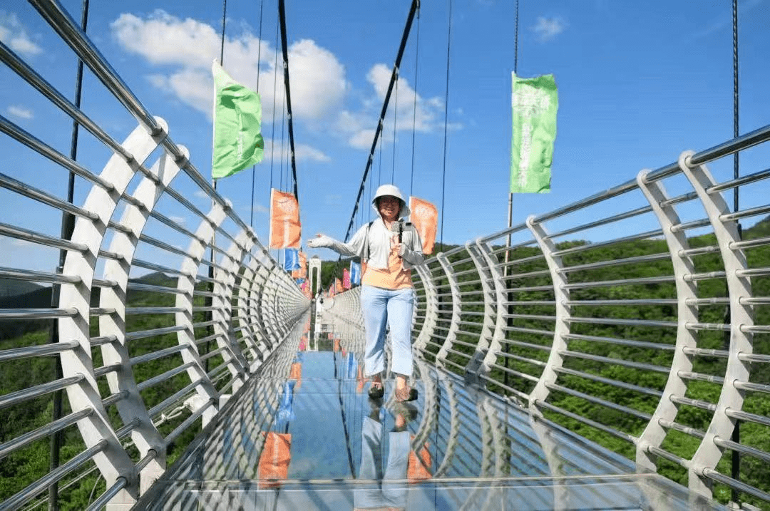 9D莲花玻璃天桥是 关东第一桥, 全省最长玻璃栈道,可遥望鸡冠山最高峰龙头峰, 鸡冠山最佳观貌点,下至村落,上至延绵山脉,尽收眼底。