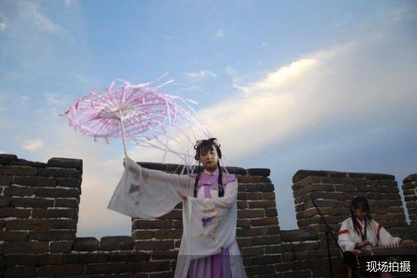 随着夜幕慢慢笼罩上天空,镶着金边儿的橘子祥云伴着落日余晖映入眼帘,穿着汉服的表演者在长城上翩翩起舞,展现国风之美。